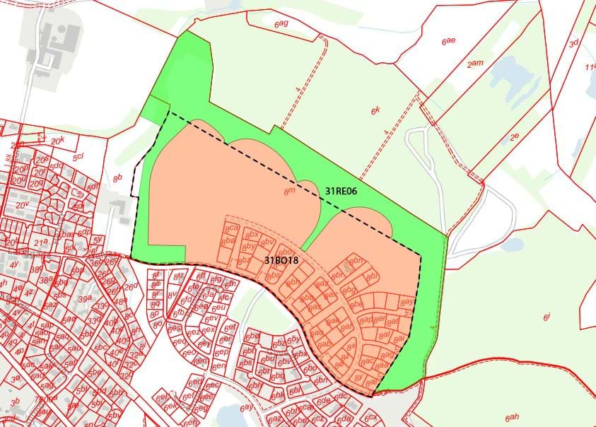 Afgrænsning af nye rammeområder 31BO18 og 31RE06 i tillægget. Det aflyste rammeområde 31BO13 er markeret med stiblet sort. (Tryk på kortet for at se det i stort format og med signaturforklaring)