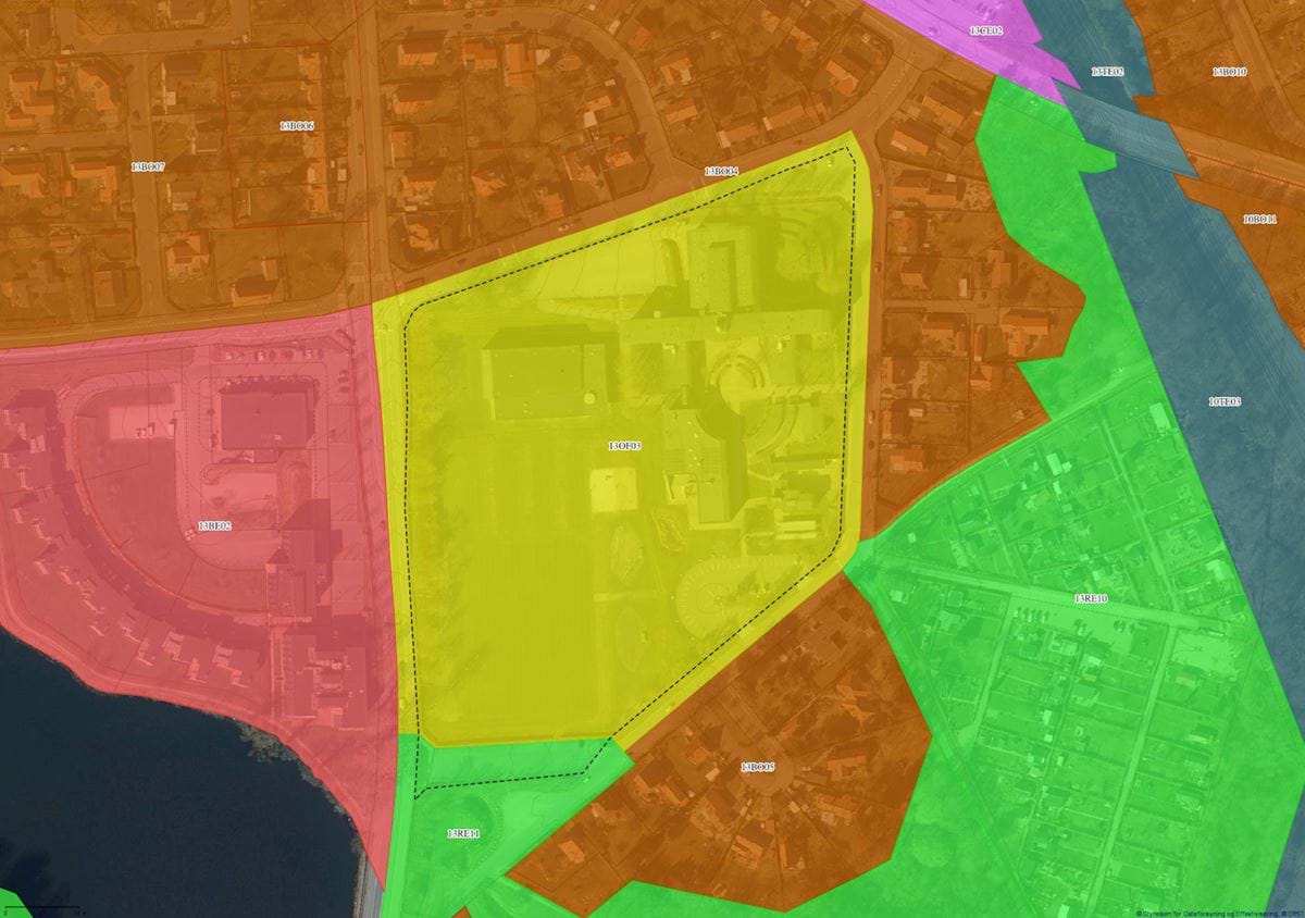 Eksisterende kommuneplanrammer med lokalplangrænsen.