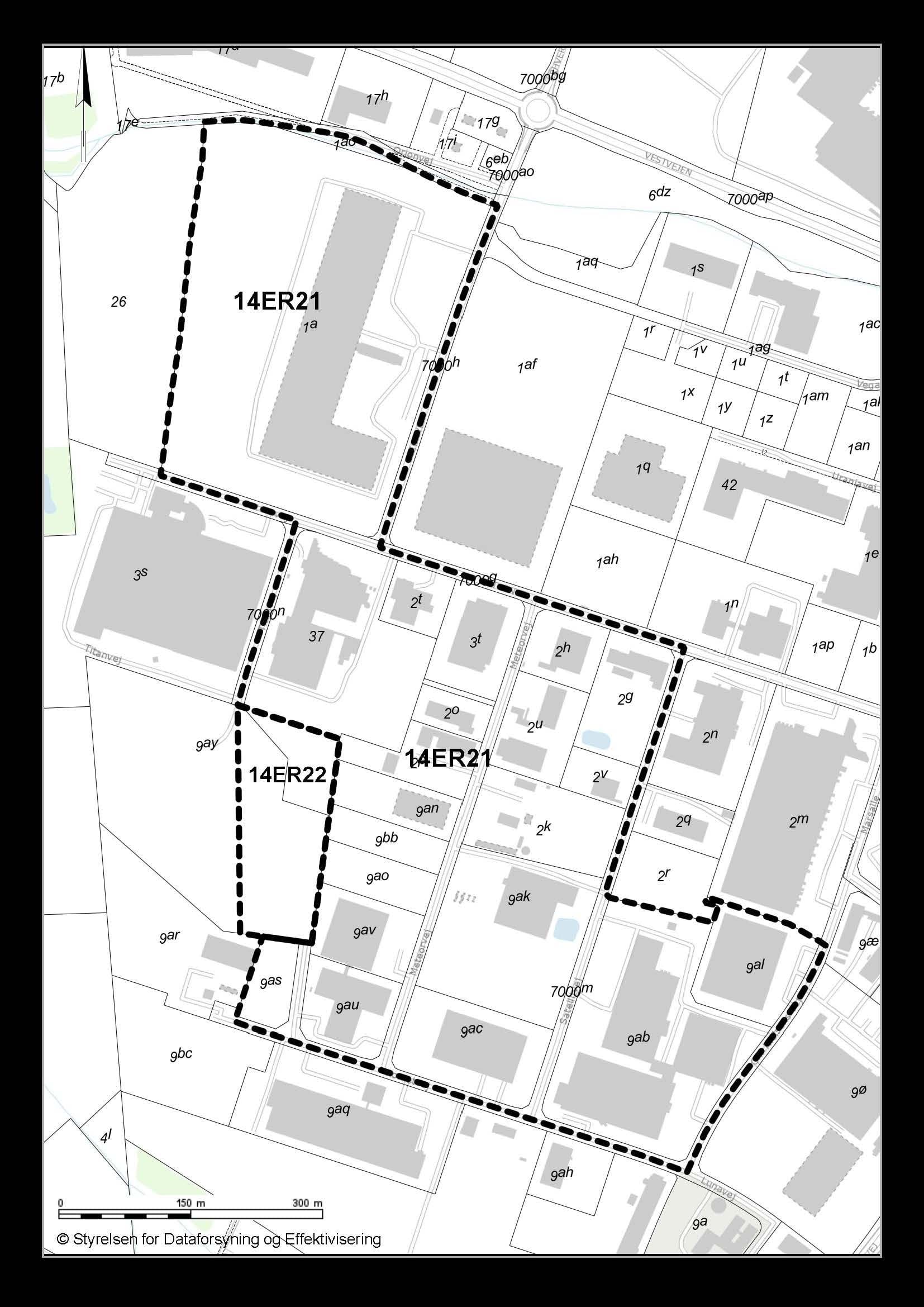 Kortet viser de nye rammer 14ER21 og 14ER22, der aflyser eksisterende 14ER12 i samme afgrænsning: