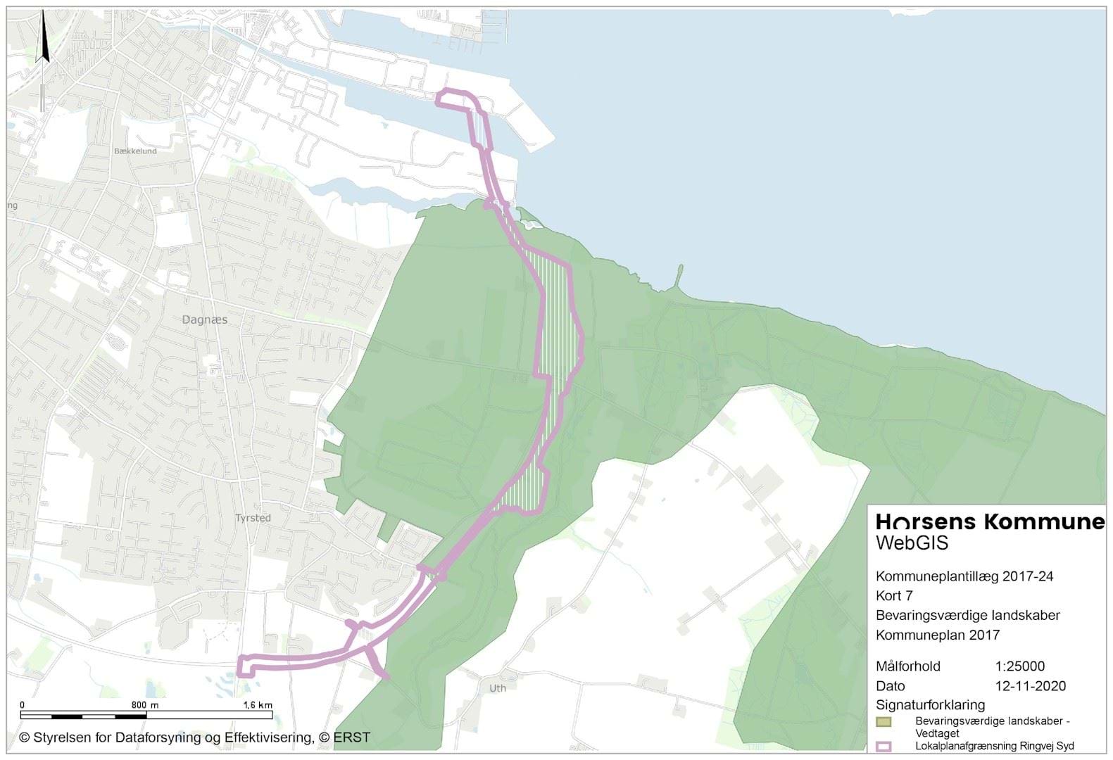 Størstedelen af planområdet ligger i et udpeget bevaringsværdigt landskab som fastholdes udpeget. Horsens Kommune vurderer, at planernes realisering ikke vil medføre væsentlige påvirkninger af oplevelsen af områdets landskab, da der ved placeringen og udformningen af anlægget tages videst muligt hensyn til de landskabelige værdier i området. Ændringerne i landskabet er varige, men det vurderes at påvirkningen i de fleste tilfælde er lokal, og de lange landskabskig bevares. Derudover giver gang- og cykelstier mulighed for at komme ud i området og skaber desuden mulighed for ny adgang til og udsigt over kystlandskabet.